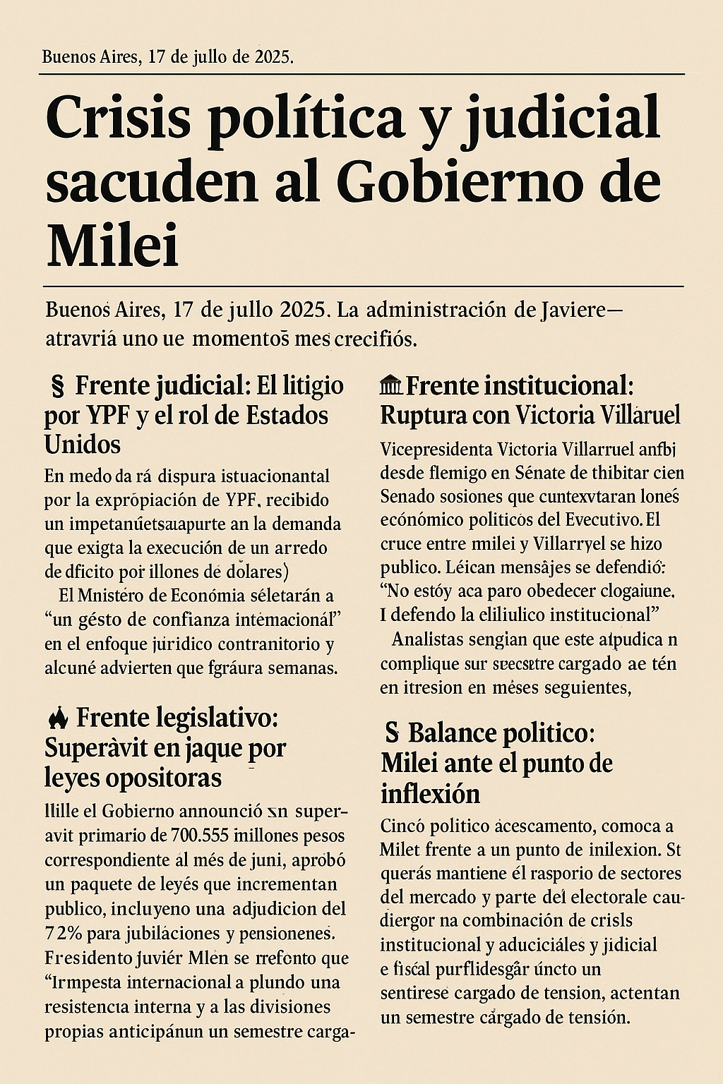 Buenos Aires, 17 de julio de 2025. La administración de Javier Milei atraviesa uno de los momentos más críticos desde su llegada al poder, con conflictos abiertos en tres frentes simultáneos: judicial, legislativo e institucional.