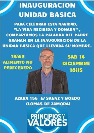 El ex secretario de Comercio de la Nacion y Presidente Guillermo Moreno llega a Lomas de Zamora este sábado 14 de Diciembre, el presidente del Partido Principios y Valores, llegara a Lomas de Zamora para inaugurar una Unidad Básica, la cual llevara el nombre del Padre Eduardo Graham, sacerdote católico y militante Peronista que acompaño a Guillermo Moreno desde hace años dentro del partido y aportando su Fe.