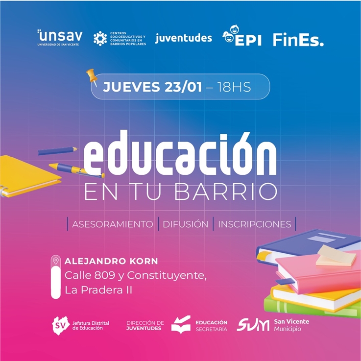 El año educativo para el municipio de San Vicente, dio comienzo el pasado martes 7 de enero en Florida y Jamaica de Alejandro Korn; continuó el 14 de enero en la avenida Almirante Brown y A.A Ciffone, de San Vicente, siguió el jueves 16 de enero, con el puesto ubicado en Ascasubi y Oyuela, en las inmediaciones de la Escuela 23 de Alejandro Korn, y se extendió en el día de hoy al barrio Eva Perón de San Vicente.