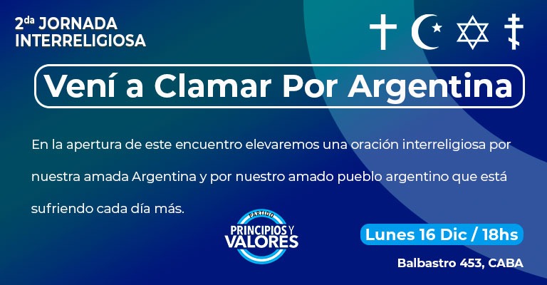 Este lunes 16 de Diciembre a las 18 hs en la sede del Sindicato del Vidrio de Balbastro 453 CABA, se realizara la segunda Jornada Interreligiosa organizada por el Partido Principios y Valores y el CEJUS (Consejo Evangélico Justicialista) que preside el Pastor David Sebastian Arrighi.